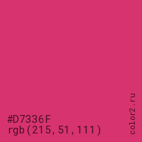 Цвет #D7336F в цветовой модели RGB обозначается тремя октетами (215, 51, 111) в десятичном формате и #D7336F в шестнадцатиричном (hex) формате, которые являются интенсивностью красного 215 (hex D7), интенсивность зелёного 51 (hex 33) и интенсивность синего 111 (hex 6F).