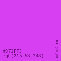 Цвет #D73FF3 в цветовой модели RGB обозначается тремя октетами (215, 63, 243) в десятичном формате и #D73FF3 в шестнадцатиричном (hex) формате, которые являются интенсивностью красного 215 (hex D7), интенсивность зелёного 63 (hex 3F) и интенсивность синего 243 (hex F3).