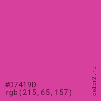 Цвет #D7419D в цветовой модели RGB обозначается тремя октетами (215, 65, 157) в десятичном формате и #D7419D в шестнадцатиричном (hex) формате, которые являются интенсивностью красного 215 (hex D7), интенсивность зелёного 65 (hex 41) и интенсивность синего 157 (hex 9D).