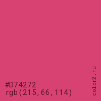 Цвет #D74272 в цветовой модели RGB обозначается тремя октетами (215, 66, 114) в десятичном формате и #D74272 в шестнадцатиричном (hex) формате, которые являются интенсивностью красного 215 (hex D7), интенсивность зелёного 66 (hex 42) и интенсивность синего 114 (hex 72).