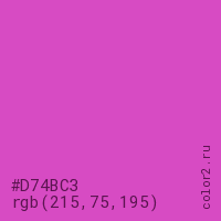 Цвет #D74BC3 в цветовой модели RGB обозначается тремя октетами (215, 75, 195) в десятичном формате и #D74BC3 в шестнадцатиричном (hex) формате, которые являются интенсивностью красного 215 (hex D7), интенсивность зелёного 75 (hex 4B) и интенсивность синего 195 (hex C3).