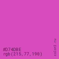 Цвет #D74DBE в цветовой модели RGB обозначается тремя октетами (215, 77, 190) в десятичном формате и #D74DBE в шестнадцатиричном (hex) формате, которые являются интенсивностью красного 215 (hex D7), интенсивность зелёного 77 (hex 4D) и интенсивность синего 190 (hex BE).