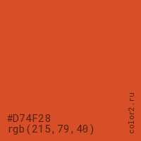 Цвет #D74F28 в цветовой модели RGB обозначается тремя октетами (215, 79, 40) в десятичном формате и #D74F28 в шестнадцатиричном (hex) формате, которые являются интенсивностью красного 215 (hex D7), интенсивность зелёного 79 (hex 4F) и интенсивность синего 40 (hex 28).