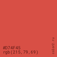Цвет #D74F45 в цветовой модели RGB обозначается тремя октетами (215, 79, 69) в десятичном формате и #D74F45 в шестнадцатиричном (hex) формате, которые являются интенсивностью красного 215 (hex D7), интенсивность зелёного 79 (hex 4F) и интенсивность синего 69 (hex 45).
