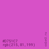 Цвет #D751C7 в цветовой модели RGB обозначается тремя октетами (215, 81, 199) в десятичном формате и #D751C7 в шестнадцатиричном (hex) формате, которые являются интенсивностью красного 215 (hex D7), интенсивность зелёного 81 (hex 51) и интенсивность синего 199 (hex C7).