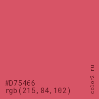 Цвет #D75466 в цветовой модели RGB обозначается тремя октетами (215, 84, 102) в десятичном формате и #D75466 в шестнадцатиричном (hex) формате, которые являются интенсивностью красного 215 (hex D7), интенсивность зелёного 84 (hex 54) и интенсивность синего 102 (hex 66).