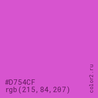 Цвет #D754CF в цветовой модели RGB обозначается тремя октетами (215, 84, 207) в десятичном формате и #D754CF в шестнадцатиричном (hex) формате, которые являются интенсивностью красного 215 (hex D7), интенсивность зелёного 84 (hex 54) и интенсивность синего 207 (hex CF).