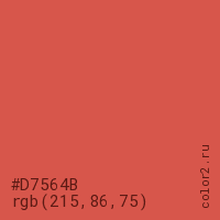 Цвет #D7564B в цветовой модели RGB обозначается тремя октетами (215, 86, 75) в десятичном формате и #D7564B в шестнадцатиричном (hex) формате, которые являются интенсивностью красного 215 (hex D7), интенсивность зелёного 86 (hex 56) и интенсивность синего 75 (hex 4B).