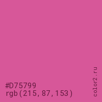 Цвет #D75799 в цветовой модели RGB обозначается тремя октетами (215, 87, 153) в десятичном формате и #D75799 в шестнадцатиричном (hex) формате, которые являются интенсивностью красного 215 (hex D7), интенсивность зелёного 87 (hex 57) и интенсивность синего 153 (hex 99).