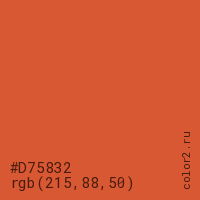 Цвет #D75832 в цветовой модели RGB обозначается тремя октетами (215, 88, 50) в десятичном формате и #D75832 в шестнадцатиричном (hex) формате, которые являются интенсивностью красного 215 (hex D7), интенсивность зелёного 88 (hex 58) и интенсивность синего 50 (hex 32).