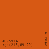 Цвет #D75914 в цветовой модели RGB обозначается тремя октетами (215, 89, 20) в десятичном формате и #D75914 в шестнадцатиричном (hex) формате, которые являются интенсивностью красного 215 (hex D7), интенсивность зелёного 89 (hex 59) и интенсивность синего 20 (hex 14).