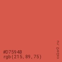 Цвет #D7594B в цветовой модели RGB обозначается тремя октетами (215, 89, 75) в десятичном формате и #D7594B в шестнадцатиричном (hex) формате, которые являются интенсивностью красного 215 (hex D7), интенсивность зелёного 89 (hex 59) и интенсивность синего 75 (hex 4B).