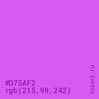Цвет #D75AF2 в цветовой модели RGB обозначается тремя октетами (215, 90, 242) в десятичном формате и #D75AF2 в шестнадцатиричном (hex) формате, которые являются интенсивностью красного 215 (hex D7), интенсивность зелёного 90 (hex 5A) и интенсивность синего 242 (hex F2).