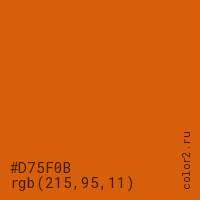 Цвет #D75F0B в цветовой модели RGB обозначается тремя октетами (215, 95, 11) в десятичном формате и #D75F0B в шестнадцатиричном (hex) формате, которые являются интенсивностью красного 215 (hex D7), интенсивность зелёного 95 (hex 5F) и интенсивность синего 11 (hex 0B).