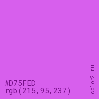 Цвет #D75FED в цветовой модели RGB обозначается тремя октетами (215, 95, 237) в десятичном формате и #D75FED в шестнадцатиричном (hex) формате, которые являются интенсивностью красного 215 (hex D7), интенсивность зелёного 95 (hex 5F) и интенсивность синего 237 (hex ED).