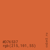 Цвет #D76537 в цветовой модели RGB обозначается тремя октетами (215, 101, 55) в десятичном формате и #D76537 в шестнадцатиричном (hex) формате, которые являются интенсивностью красного 215 (hex D7), интенсивность зелёного 101 (hex 65) и интенсивность синего 55 (hex 37).