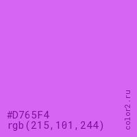 Цвет #D765F4 в цветовой модели RGB обозначается тремя октетами (215, 101, 244) в десятичном формате и #D765F4 в шестнадцатиричном (hex) формате, которые являются интенсивностью красного 215 (hex D7), интенсивность зелёного 101 (hex 65) и интенсивность синего 244 (hex F4).
