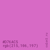 Цвет #D76AC5 в цветовой модели RGB обозначается тремя октетами (215, 106, 197) в десятичном формате и #D76AC5 в шестнадцатиричном (hex) формате, которые являются интенсивностью красного 215 (hex D7), интенсивность зелёного 106 (hex 6A) и интенсивность синего 197 (hex C5).