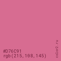 Цвет #D76C91 в цветовой модели RGB обозначается тремя октетами (215, 108, 145) в десятичном формате и #D76C91 в шестнадцатиричном (hex) формате, которые являются интенсивностью красного 215 (hex D7), интенсивность зелёного 108 (hex 6C) и интенсивность синего 145 (hex 91).
