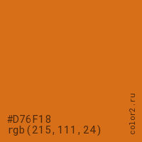 Цвет #D76F18 в цветовой модели RGB обозначается тремя октетами (215, 111, 24) в десятичном формате и #D76F18 в шестнадцатиричном (hex) формате, которые являются интенсивностью красного 215 (hex D7), интенсивность зелёного 111 (hex 6F) и интенсивность синего 24 (hex 18).
