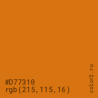 Цвет #D77310 в цветовой модели RGB обозначается тремя октетами (215, 115, 16) в десятичном формате и #D77310 в шестнадцатиричном (hex) формате, которые являются интенсивностью красного 215 (hex D7), интенсивность зелёного 115 (hex 73) и интенсивность синего 16 (hex 10).