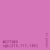 Цвет #D775B9 в цветовой модели RGB обозначается тремя октетами (215, 117, 185) в десятичном формате и #D775B9 в шестнадцатиричном (hex) формате, которые являются интенсивностью красного 215 (hex D7), интенсивность зелёного 117 (hex 75) и интенсивность синего 185 (hex B9).