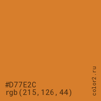 Цвет #D77E2C в цветовой модели RGB обозначается тремя октетами (215, 126, 44) в десятичном формате и #D77E2C в шестнадцатиричном (hex) формате, которые являются интенсивностью красного 215 (hex D7), интенсивность зелёного 126 (hex 7E) и интенсивность синего 44 (hex 2C).