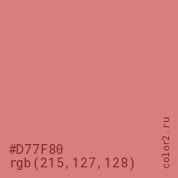 Цвет #D77F80 в цветовой модели RGB обозначается тремя октетами (215, 127, 128) в десятичном формате и #D77F80 в шестнадцатиричном (hex) формате, которые являются интенсивностью красного 215 (hex D7), интенсивность зелёного 127 (hex 7F) и интенсивность синего 128 (hex 80).