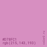 Цвет #D78FC1 в цветовой модели RGB обозначается тремя октетами (215, 143, 193) в десятичном формате и #D78FC1 в шестнадцатиричном (hex) формате, которые являются интенсивностью красного 215 (hex D7), интенсивность зелёного 143 (hex 8F) и интенсивность синего 193 (hex C1).