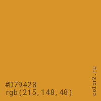 Цвет #D79428 в цветовой модели RGB обозначается тремя октетами (215, 148, 40) в десятичном формате и #D79428 в шестнадцатиричном (hex) формате, которые являются интенсивностью красного 215 (hex D7), интенсивность зелёного 148 (hex 94) и интенсивность синего 40 (hex 28).