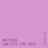 Цвет #D795CD в цветовой модели RGB обозначается тремя октетами (215, 149, 205) в десятичном формате и #D795CD в шестнадцатиричном (hex) формате, которые являются интенсивностью красного 215 (hex D7), интенсивность зелёного 149 (hex 95) и интенсивность синего 205 (hex CD).