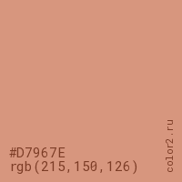 Цвет #D7967E в цветовой модели RGB обозначается тремя октетами (215, 150, 126) в десятичном формате и #D7967E в шестнадцатиричном (hex) формате, которые являются интенсивностью красного 215 (hex D7), интенсивность зелёного 150 (hex 96) и интенсивность синего 126 (hex 7E).
