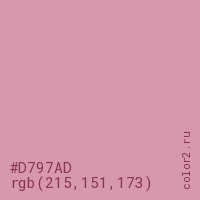Цвет #D797AD в цветовой модели RGB обозначается тремя октетами (215, 151, 173) в десятичном формате и #D797AD в шестнадцатиричном (hex) формате, которые являются интенсивностью красного 215 (hex D7), интенсивность зелёного 151 (hex 97) и интенсивность синего 173 (hex AD).