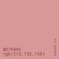 Цвет #D79896 в цветовой модели RGB обозначается тремя октетами (215, 152, 150) в десятичном формате и #D79896 в шестнадцатиричном (hex) формате, которые являются интенсивностью красного 215 (hex D7), интенсивность зелёного 152 (hex 98) и интенсивность синего 150 (hex 96).