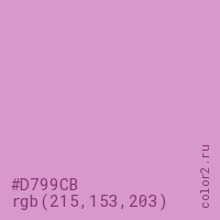 Цвет #D799CB в цветовой модели RGB обозначается тремя октетами (215, 153, 203) в десятичном формате и #D799CB в шестнадцатиричном (hex) формате, которые являются интенсивностью красного 215 (hex D7), интенсивность зелёного 153 (hex 99) и интенсивность синего 203 (hex CB).