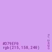 Цвет #D79EF0 в цветовой модели RGB обозначается тремя октетами (215, 158, 240) в десятичном формате и #D79EF0 в шестнадцатиричном (hex) формате, которые являются интенсивностью красного 215 (hex D7), интенсивность зелёного 158 (hex 9E) и интенсивность синего 240 (hex F0).