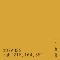 Цвет #D7A438 в цветовой модели RGB обозначается тремя октетами (215, 164, 56) в десятичном формате и #D7A438 в шестнадцатиричном (hex) формате, которые являются интенсивностью красного 215 (hex D7), интенсивность зелёного 164 (hex A4) и интенсивность синего 56 (hex 38).