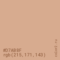 Цвет #D7AB8F в цветовой модели RGB обозначается тремя октетами (215, 171, 143) в десятичном формате и #D7AB8F в шестнадцатиричном (hex) формате, которые являются интенсивностью красного 215 (hex D7), интенсивность зелёного 171 (hex AB) и интенсивность синего 143 (hex 8F).