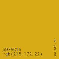 Цвет #D7AC16 в цветовой модели RGB обозначается тремя октетами (215, 172, 22) в десятичном формате и #D7AC16 в шестнадцатиричном (hex) формате, которые являются интенсивностью красного 215 (hex D7), интенсивность зелёного 172 (hex AC) и интенсивность синего 22 (hex 16).