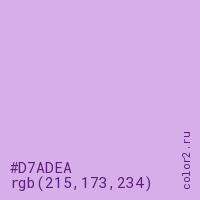 Цвет #D7ADEA в цветовой модели RGB обозначается тремя октетами (215, 173, 234) в десятичном формате и #D7ADEA в шестнадцатиричном (hex) формате, которые являются интенсивностью красного 215 (hex D7), интенсивность зелёного 173 (hex AD) и интенсивность синего 234 (hex EA).