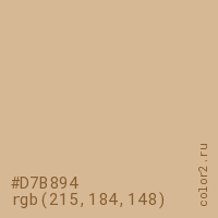 Цвет #D7B894 в цветовой модели RGB обозначается тремя октетами (215, 184, 148) в десятичном формате и #D7B894 в шестнадцатиричном (hex) формате, которые являются интенсивностью красного 215 (hex D7), интенсивность зелёного 184 (hex B8) и интенсивность синего 148 (hex 94).