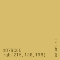 Цвет #D7BC6C в цветовой модели RGB обозначается тремя октетами (215, 188, 108) в десятичном формате и #D7BC6C в шестнадцатиричном (hex) формате, которые являются интенсивностью красного 215 (hex D7), интенсивность зелёного 188 (hex BC) и интенсивность синего 108 (hex 6C).