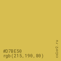 Цвет #D7BE50 в цветовой модели RGB обозначается тремя октетами (215, 190, 80) в десятичном формате и #D7BE50 в шестнадцатиричном (hex) формате, которые являются интенсивностью красного 215 (hex D7), интенсивность зелёного 190 (hex BE) и интенсивность синего 80 (hex 50).