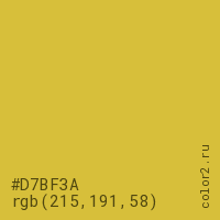 Цвет #D7BF3A в цветовой модели RGB обозначается тремя октетами (215, 191, 58) в десятичном формате и #D7BF3A в шестнадцатиричном (hex) формате, которые являются интенсивностью красного 215 (hex D7), интенсивность зелёного 191 (hex BF) и интенсивность синего 58 (hex 3A).