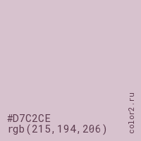 Цвет #D7C2CE в цветовой модели RGB обозначается тремя октетами (215, 194, 206) в десятичном формате и #D7C2CE в шестнадцатиричном (hex) формате, которые являются интенсивностью красного 215 (hex D7), интенсивность зелёного 194 (hex C2) и интенсивность синего 206 (hex CE).