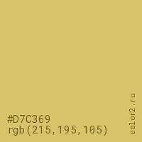 Цвет #D7C369 в цветовой модели RGB обозначается тремя октетами (215, 195, 105) в десятичном формате и #D7C369 в шестнадцатиричном (hex) формате, которые являются интенсивностью красного 215 (hex D7), интенсивность зелёного 195 (hex C3) и интенсивность синего 105 (hex 69).