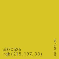 Цвет #D7C526 в цветовой модели RGB обозначается тремя октетами (215, 197, 38) в десятичном формате и #D7C526 в шестнадцатиричном (hex) формате, которые являются интенсивностью красного 215 (hex D7), интенсивность зелёного 197 (hex C5) и интенсивность синего 38 (hex 26).