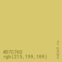 Цвет #D7C76D в цветовой модели RGB обозначается тремя октетами (215, 199, 109) в десятичном формате и #D7C76D в шестнадцатиричном (hex) формате, которые являются интенсивностью красного 215 (hex D7), интенсивность зелёного 199 (hex C7) и интенсивность синего 109 (hex 6D).