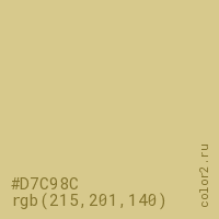 Цвет #D7C98C в цветовой модели RGB обозначается тремя октетами (215, 201, 140) в десятичном формате и #D7C98C в шестнадцатиричном (hex) формате, которые являются интенсивностью красного 215 (hex D7), интенсивность зелёного 201 (hex C9) и интенсивность синего 140 (hex 8C).