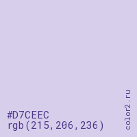 Цвет #D7CEEC в цветовой модели RGB обозначается тремя октетами (215, 206, 236) в десятичном формате и #D7CEEC в шестнадцатиричном (hex) формате, которые являются интенсивностью красного 215 (hex D7), интенсивность зелёного 206 (hex CE) и интенсивность синего 236 (hex EC).
